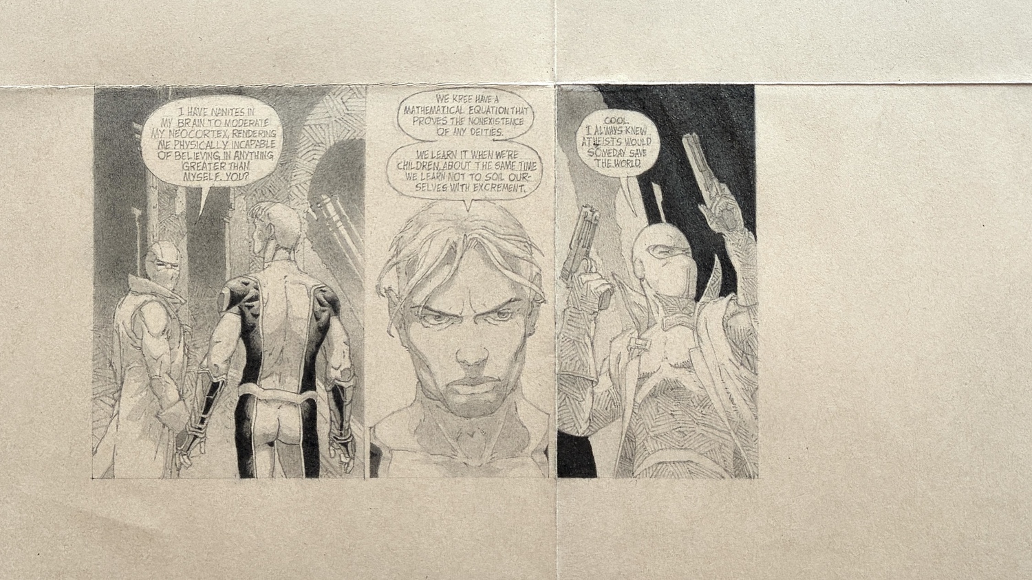 I found a Gagosian exhibition invitation someone had thrown out. Someone had posted this image from a comic book - which one, I do not know, possibly some Marvel/DC spin-off - where two alien soldiers brag how they are incapable of believing in god.